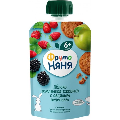 Пюре фруктово-ягодное ФРУТОНЯНЯ Яблоко, земляника и ежевика, с овсяным печеньем, с 6 месяцев, 90г в магазинах Лента