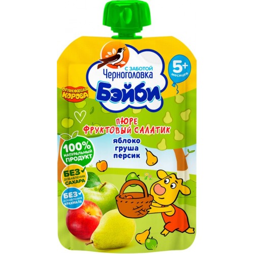 Пюре фруктовое ЧЕРНОГОЛОВКА Бэйби Фруктовый Салатик, предназначенное для питания малышей с 5-ти месяцев, включает в себя яблоко, грушу и персик. Этот продукт обладает нежной консистенением, приятным вкусом, а главное - полностью натуральным составом, не содержащим сахара.
