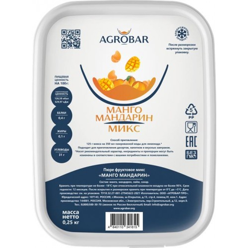 Пюре фруктовое замороженное АГРОБАР ПРО Манго-мандарин, 250г в магазинах Лента