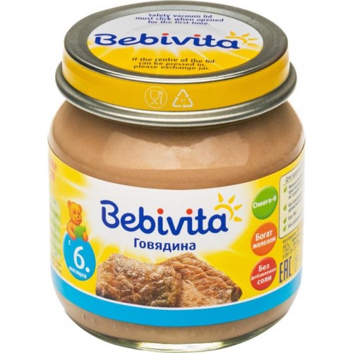 Пюре мясное BEBIVITA Говядина - это высококачественный продукт, предназначенный для питания детей от 6 месяцев и старше. Это нежное и вкусное пюре, не только расширяющее рацион малыша, но и приносящее пользу его организму. Продукт отличается низким содержанием аллергенов, так как приготовлен без добавления соли. Благодаря этому, пюре богато железом - важным элементом для нормального кроветворения и полноценного умственного развития ребенка.