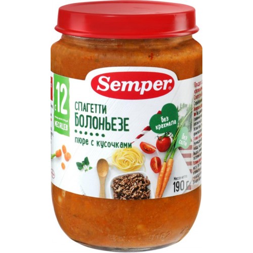 Пюре SEMPER Спагетти Болоньезе, с 12 месяцев, 190г в магазинах Лента