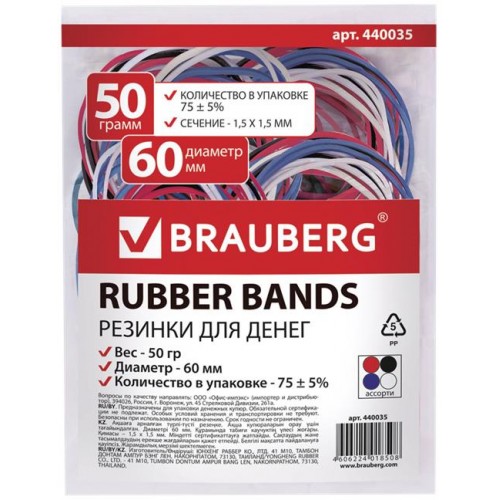 Резинки банковские BRAUBERG d=6см, универсальные, цветные в магазинах Лента