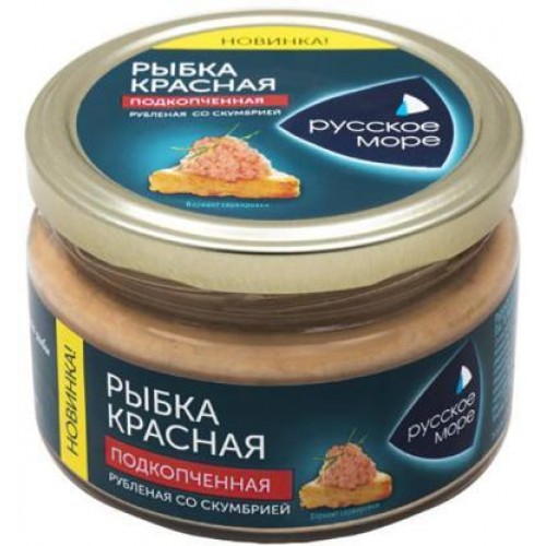 Рыбка красная Русское Море Подкопченная рубленая 180г - это изысканный деликатес, представляющий собой рыбное изделие из красных сортов рыб и скумбрии, мелко порубленных и прошедших горячее копчение. Изготовленный из мяса горбуши, кеты и скумбрии, этот продукт обладает нежным ароматом копчености и плотной текстурой, а также насыщенным вкусом копченой рыбы.