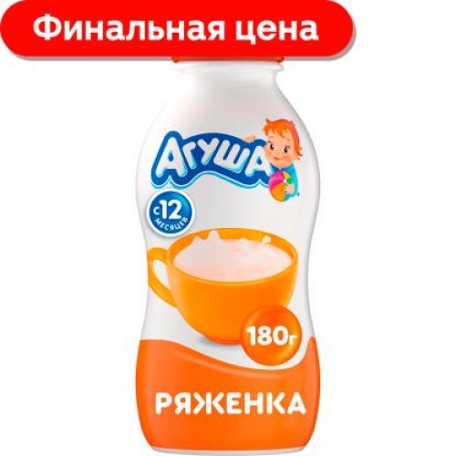 Упаковка ряженки Агуша Детская объемом 180 г идеально подходит для кормления малышей и позволяет контролировать количество потребляемого продукта.