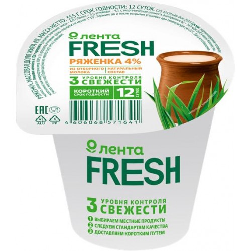 Ряженка ЛЕНТА FRESH 4%, без змж, 290г в магазинах Лента