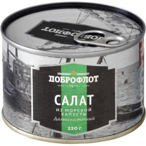 Салат из морской капусты «Доброфлот» весом 220 грамм продаётся в жестяной баночке с ключом для удобства открывания. На упаковке присутствует красочный рисунок, логотип производителя, а также информация о продукте и изготовителе.