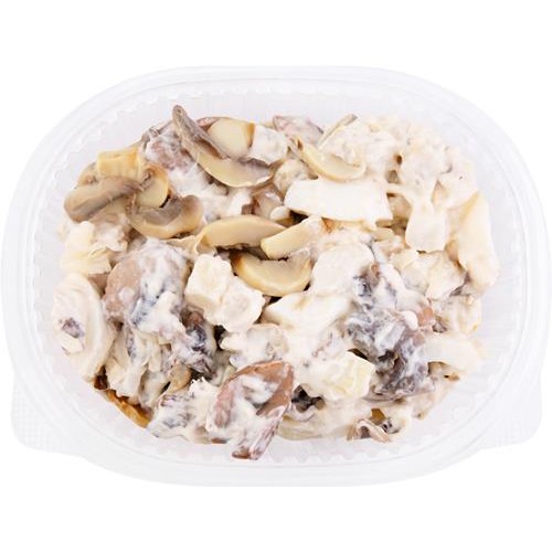Майонез,картофель,шампиньоны,яйцо куриное,филе куриное,сыр,соль,перец черный молотый.Дата и время изготовления указана на доп.этикетке.Кул.изд.Продукт готов к употреблению.