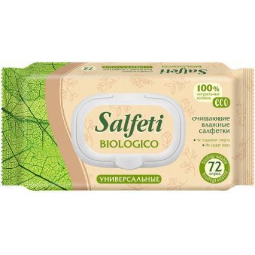 Салфетки влажные Salfeti Eco универсальные очищающие, 72 шт. - это гигиенический продукт, который обладает бактерицидным и антисептическим свойствами, что обеспечивает бережное и эффективное очищение кожи. Они изготовлены из нетканого материала и пропитаны специальной жидкостью, которая быстро проникает в кожу, увлажняя и защищая ее.