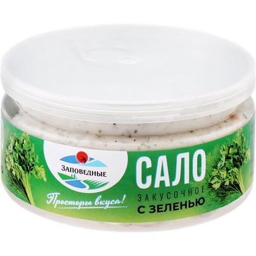 Сало ЗАПОВЕДНЫЕ ПРОДУКТЫ Закусочное с зеленью - это изысканный мясной продукт, приготовленный из высококачественного шпика. Его особенность заключается в уникальной рецептуре: соление перетертого с перцем, чесноком и душистой зеленью сала создает неповторимый вкус и аромат. Это идеальный выбор для гурманов и любителей вкусных мясных продуктов.