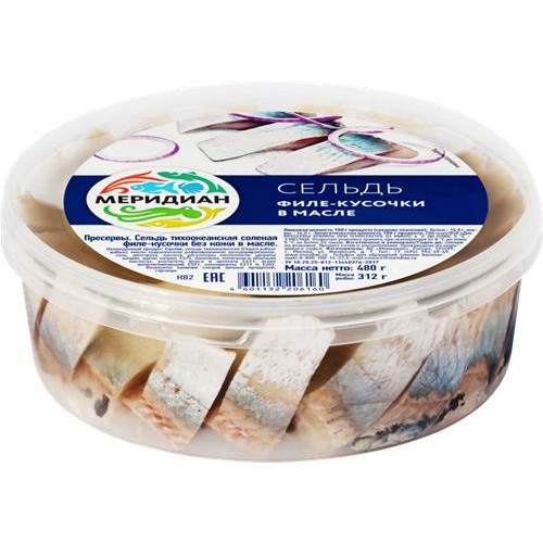 Сельдь МЕРИДИАН филе-кусочки в масле, 480г в магазинах Лента
