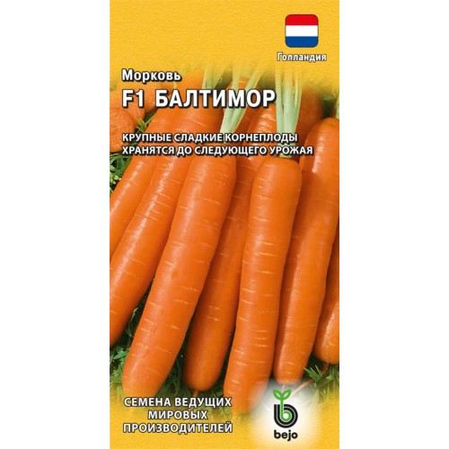 Купите семена среднеспелого продуктивного гибрида моркови Балтимор F1 в . Созревание наступает через 103 дня после всходов, что позволяет производить посев в июне. Растение формирует мощную, длинную и ровную морковь цилиндрической формы, весом 120-250 г. Оранжевая сердцевина и кора делают мякоть сладкой и богатой на содержание каротина.