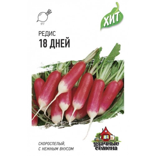 Предлагаются семена раннеспелого редиса сорта 18 дней, который от прорастания до технической спелости растет всего за 18-20 дней. Каждый корнеплод имеет удлиненно-цилиндрическую форму с розовой верхушкой и белым кончиком, а его масса достигает 17 г. Мякоть плотная и слабо острая, белого цвета. Вкус отличный. При этом урожайность составляет 2,3 кг с каждого квадратного метра.