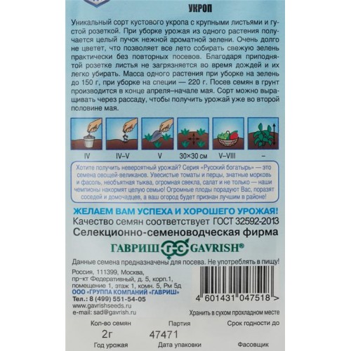 Семена ГАВРИШ Укроп Русский гигант серия Русский богатырь, 2г в магазинах Лента