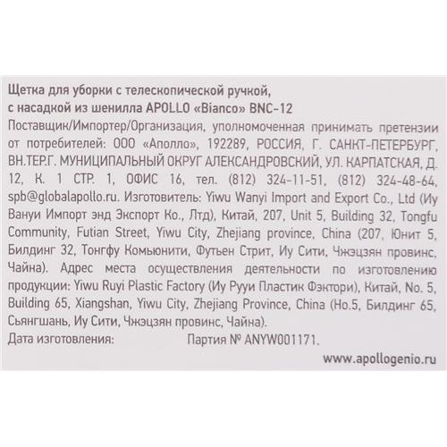 Щетка для уборки APOLLO Bianco, с телескопической ручкой, с насадкой из шенилла, Арт. BNC-12 в магазинах Лента