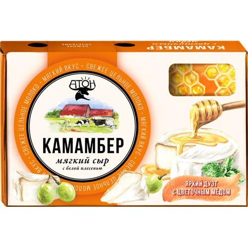 Камамбер АТОН - мягкий сыр с изысканным вкусом и нежной текстурой, покрытый белой плесенью. Производится из свежего, цельного коровьего молока с добавлением ароматного натурального меда. Не содержит заменителей молочных жиров, что делает его вкус особенно насыщенным и приятным.