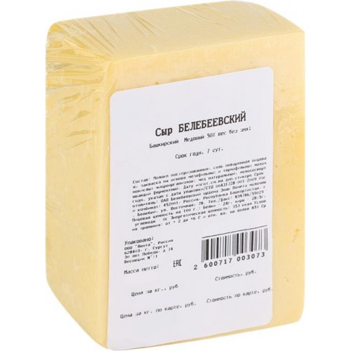 Сыр полутвердый Башкирский Медовый БЕЛЕБЕЕВСКИЙ 50% обладает неповторимым ароматом душистых целебных трав и нежным медовым вкусом с тонким мягким послевкусием. Этот продукт сохранил в себе чистоту башкирского воздуха и свежесть просторных лесов и полей, благодаря чему он обладает экологичностью и высоким качеством.