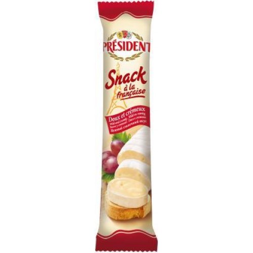 Сыр President Snack a la Francaise – это мягкий французский сыр с белой плесенью, жирностью 60%, упакованный в фольгу. Вес сыра составляет 170 грамм. Белая корочка на сыре придает ему неповторимый внешний вид и шарм. Благодаря специальной разметке на сыре, его удобно нарезать на равные небольшие кусочки.