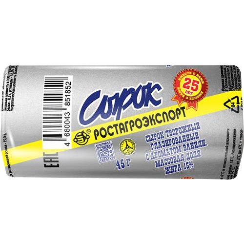 Сырок творожный глазированный РОСТАГРОЭКСПОРТ с ванилином 15%, без змж, 45г в магазинах Лента