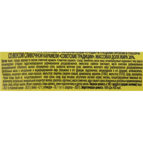 Сырок творожный глазированный СОВЕТСКИЕ ТРАДИЦИИ с грушей и грецким орехом – это изысканный десерт, созданный из натуральных ингредиентов. Без заменителей молочных жиров, продукт содержит 26% творога и сливочное масло. Начинка из сочной груши Дюшес и посыпанный дробленый грецкий орех придают лакомству неповторимый вкус.