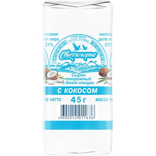 Сырок творожный глазированный СВИТЛОГОРЬЕ с кокосовой стружкой в белой глазури 23%, без змж, 45г в магазинах Лента