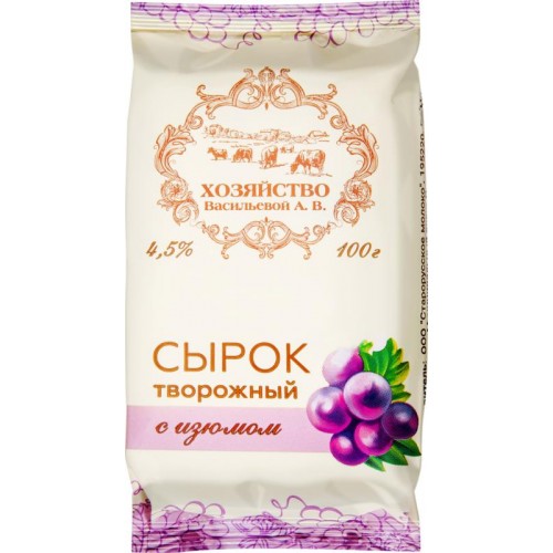 Сырок творожный ХОЗЯЙСТВО ВАСИЛЬЕВОЙ А.В. с изюмом 4,5%, без змж, 100г в магазинах Лента