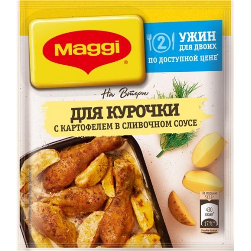 Мясо курицы, приготовленное с помощью Maggi На Второй, будет исключительно сочным и нежным, а картофель, пропитанный сливочным соусом, станет отличным гарниром. Композиция из овощей, ароматных трав и пряностей поможет раскрыть всю палитру вкусов и ароматов вашего блюда, делая его незабываемым.