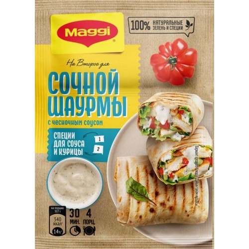 Описание товара: Готовьте вкусную и сочную шаурму прямо у себя дома с помощью MAGGI на второе! В наборе вы найдете две смеси: для приготовления нежного чесночного соуса и пикантной обжарки курицы. Все ингредиенты натуральные и качественные. А пошаговая инструкция на упаковке поможет вам без труда создать настоящий кулинарный шедевр.