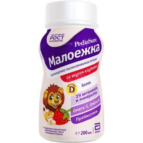 «PediaSure Малоежка со вкусом клубники 200 мл - это идеальное решение для детей в возрасте от 1 до 10 лет, которые любят сочную летнюю клубнику и не любят супы. Эта специальная смесь содержит все необходимые витамины и микроэлементы, поддерживающие здоровый рост и развитие ребенка. Благодаря пребиотикам, смесь благотворно влияет на работу желудочно-кишечного тракта. Одним из преимуществ является то, что она не содержит молочный белок, поэтому подходит для детей с лактозной непереносимостью. В линейке PediaSure есть еще пять различных вкусов на выбор вашего ребенка.»