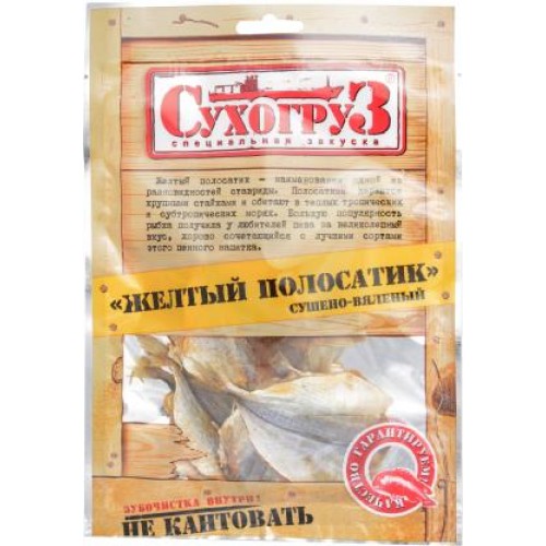 Снэк рыбный «Сухогруз Желтый полосатик» 70 г - это натуральный и вкусный продукт, представленный в виде небольшой сушеной рыбки, которая является готовым к употреблению продуктом. Основной средой обитания Желтого Полосатика являются теплые тропические воды, что придает ему особый вкус и аромат.