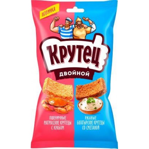 Описание: эти сухарики - идеальный выбор для тех, кто хочет насладиться вкусом двух любимых продуктов в одном. Пшенично-ржаная смесь содержит сухарики со сладкими крабовыми нотками и сухарики с ароматом сметаны, зелени и ржаного хлеба.