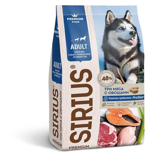 Сухой корм для собак с повышенной активностью SIRIUS три мяса с овощами, 2 кг (kastd) в магазинах Ашан