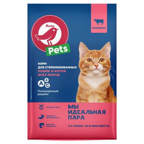 Корм сухой для стерилизованных кошек АШАН Красная птица с говядиной, 1,5 кг (kastd) в магазинах Ашан
