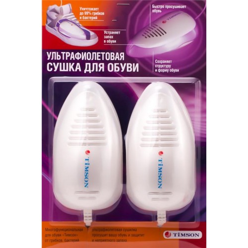 Температура воздуха при сушке Тимсон 2426 не превышает 70 градусов, что исключает возможность повреждения обуви. Теперь вы можете быть уверены, что ваша обувь будет всегда чистой, свежей и безопасной для носки.