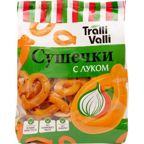 Сушки TRALLI VALLI с луком - идеальный выбор для быстрого и вкусного перекуса между основными приемами пищи. Благодаря яркому аромату и вкусу лука, они придадут вашему перекусу особую нотку.