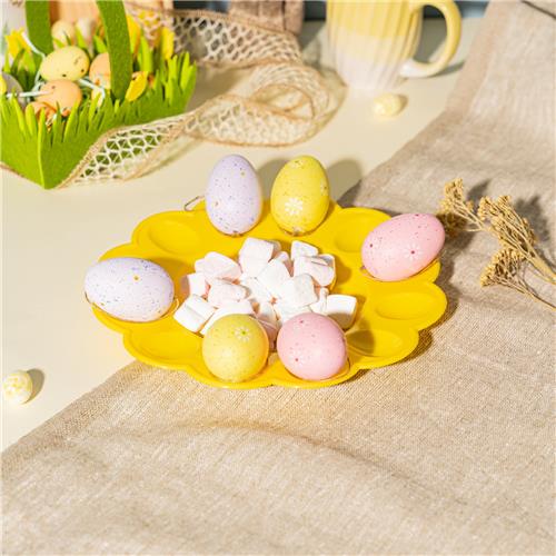 Тарелка Домашняя Кухня идеально подойдет для сервировки пасхального стола. Она рассчитана на 12 крашенных яиц, а в центре имеет специальное углубление для размещения кулича или творожной пасхи. Изготовлена тарелка из качественного полипропилена. Диаметр изделия составляет 23.5 см. Стильный и практичный дизайн с легкостью дополнит любой интерьер и станет отличным украшением праздничного стола. Благодаря материалу изготовления, тарелка легко моется и не впитывает запахи. Представлен товар в ассортименте.