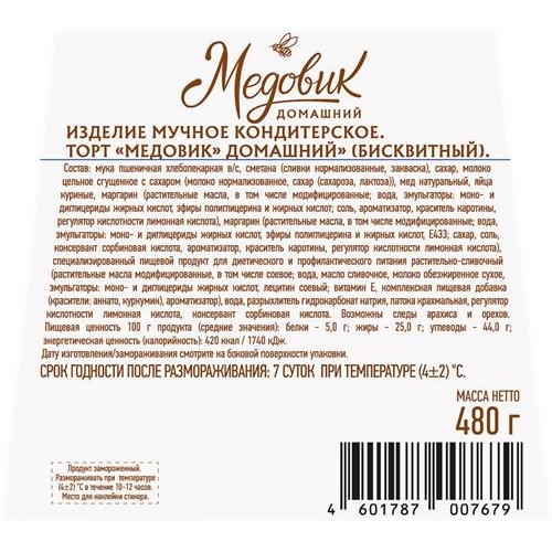 Мука пш х/п в/с, сметана (сливки норм, закваска), сахар, молоко цельн сгущ с сахаром (молоко нормализованное, сахар (сахароза,лактоза)), мед натуральный, яйца куриные, маргарин (раст мас, в том числе модиф, вода, эмульгаторы: моно- и диглицериды жирныхкислот, эфиры полиглицерина и жирных кислот, соль, ар-р, крас каротины, р-р к-ти лим к-та), маргарин (раст мас, Вода, эмульгаторы:моно- и диглицериды жирных кислот, соевый лецитин, соль, р-р к-ти лим к-та, консервант сорбат калия, ар-р, красители: аннато,куркумин, экстракт зеленого чая), продукт растительно-слив специализированный пищевой для диетического профилактического питания(зам молочного жира (раст мас, в том числе модиф и соевое, эмульгаторы: моно- и диглицериды жирных кислот, соевый лецитин,комплексная пищ добавка