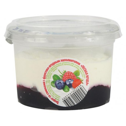 творог обезжиренный, сливки пастеризованные, фруктово-ягодный наполнитель (сахар, черника, клубника, малина, вода, стабилизатор – дикрахмалфосфат оксипропилированный, ароматизатор, красители – кармин, экстракт паприки, регулятор кислотности – лимонная кислота).