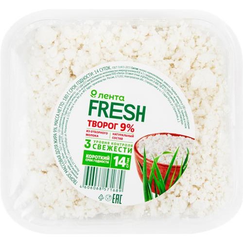 Творог ЛЕНТА FRESH 9%, без змж, 180г в магазинах Лента