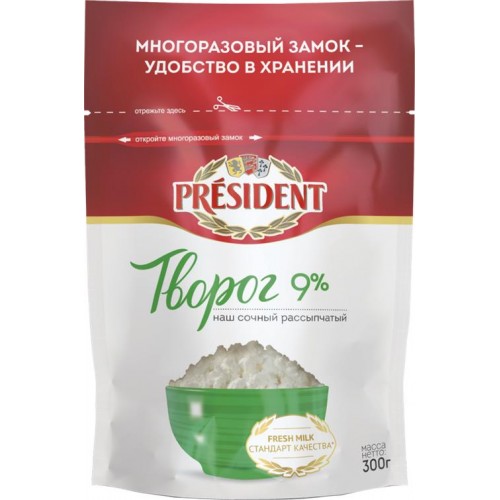 Творог рассыпчатый PRESIDENT 9%, без змж, 300г в магазинах Лента