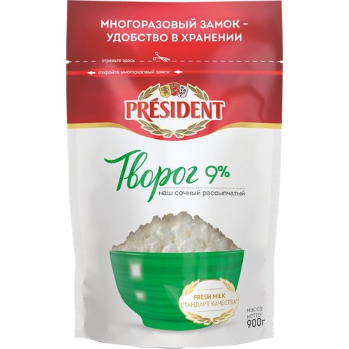 Творог рассыпчатый PRESIDENT 9%, без змж, 900г в магазинах Лента