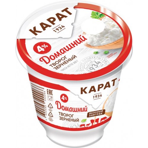 Творог зернёный Домашний 4% от КАРАТ - натуральный продукт, изготовленный из отборного коровьего молока, свежей закваски и густых сливок. Увеличенное содержание сливок позволяет сохранить нежную и естественную текстуру творожного зерна, а отсутствие консервантов и искусственных вкусовых добавок гарантирует безопасность и свежесть продукта на протяжении всего срока его годности - всего 17 дней!