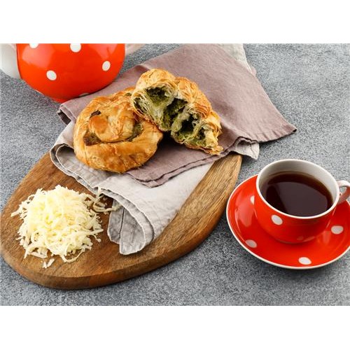 Мука пшеничная хлебопекарная высший сорт, вода, шпинат, сыр сулугуни(молоко, соль, бактериальная закваска, ферментный препарат животного происхождения, уплотнительЕ509), масло растительное, соль, сахар, чеснок, семена кунжута, крахмал кукурузный. Продукт готов к употреблению. Дата и время изготовления указаны на доп. этикетке. Может содержать следы яиц.