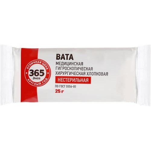Вата медицинская хлопковая 365 ДНЕЙ гигроскопическая хирургическая нестерильная, 25г в магазинах Лента