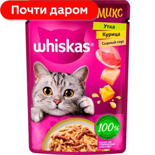 Влажный корм для кошек Whiskas полнорационный Аппетитный микс С курицей и уткой в сырном соусе 75г в магазинах Магнит