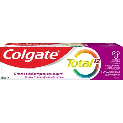 COLGATE Total 12 Профессиональная Здоровье Десен - это уникальная зубная паста, которая поможет улучшить здоровье ваших десен, уменьшить их кровоточивость и защитить от воспаления. Ее передовая формула борется с распространением бактерий, являющихся основной причиной воспаления, не только на зубах, но и на языке, щеках и деснах, обеспечивая 12-часовую защиту* ежедневно.