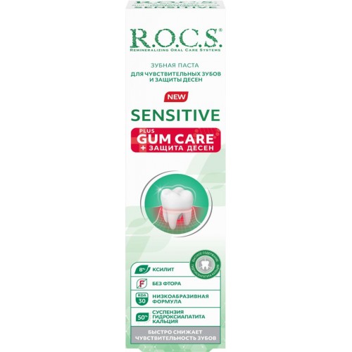 Зубная паста R.O.C.S. Sensitive Plus Gum Care - это эффективное решение для людей с чувствительными зубами и кровоточивостью десен. Благодаря уникальному составу, она снижает чувствительность зубов и защищает от множества проблем, таких как кариес, воспаление и разрушение зубов.
