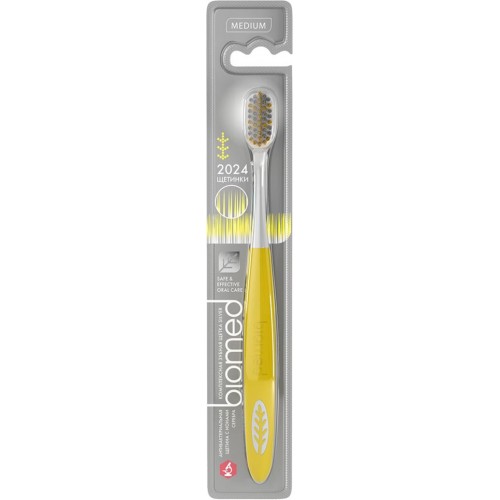 Уникальная зубная щетка Biomed Комплексная обеспечивает бережное удаление зубного налета, препятствует размножению бактерий и легко очищает труднодоступные места от кариеса. Щетинки средней жесткости аккуратно массируют десны и облегчают доступ к жевательной поверхности зубов. Щетка оснащена ионами серебра, которые известны своим антибактериальным эффектом.